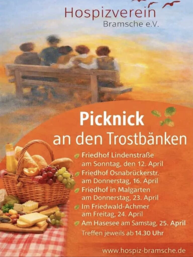 Der Hospizverein Bramsche e.V. lädt zum Picknick an den Trostbänken ein. In entspannter Atmosphäre möchten wir gemeinsam Zeit verbringen und ins Gespräch kommen. Wir freuen uns auf schöne Begegnungen, Austausch