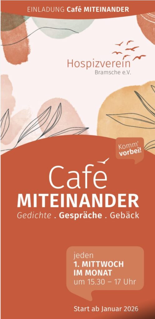 Ein gemütlicher Treffpunkt für alle Interessierten. Hier gibt es Informationen rund um unseren Hospizverein. Bei Kaffee und Kuchen in entspannter, lockerer Atmosphäre tauschen wir Erfahrungen aus, teilen Inspirationen und genießen wohltuende Gespräche miteinander. Gemeinsam schaffen wir einen Ort des Austauschs, des Miteinanders und der offenen Begegnung.